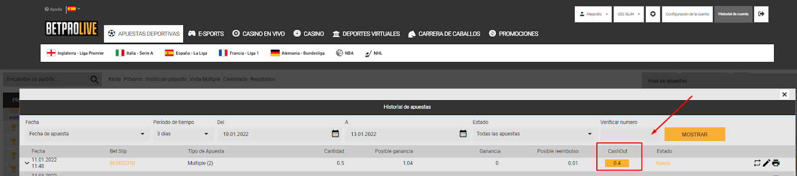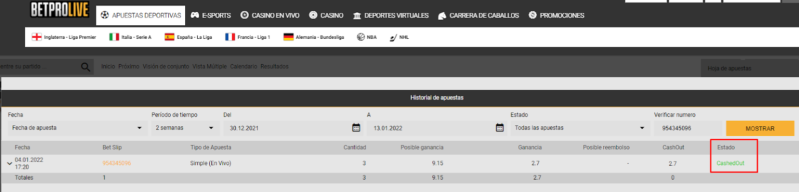 In case of having made the cashout, in the betting history we will be able to see the status of the bet in green indicating that the cashout has been collected.