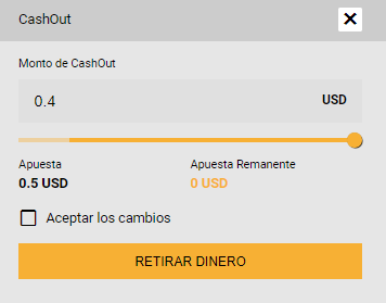 When the ticket includes a match in progress, the system will ask the player if he wants to make a total or partial cashout of that bet. In these cases, by moving the yellow line to the right, the amount of the refund can be calculated. After accepting the amount offered by the system, the client is informed that the transaction has been completed.