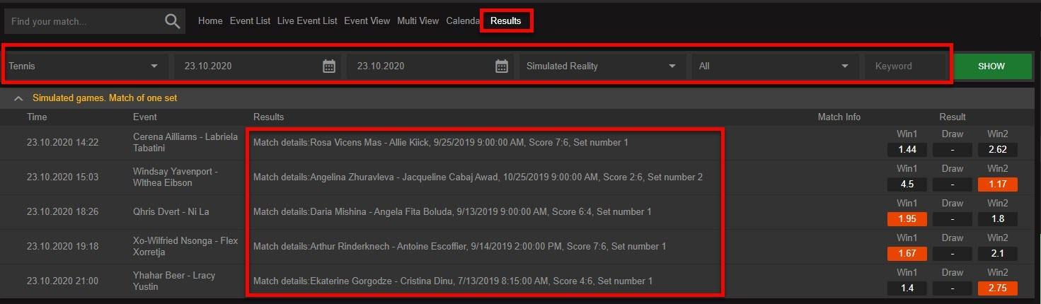 Simulated reality tennis offered by LSports provider represents the simulation of real tennis matches. The simulation of the matches is based on the data of ever played real tennis matches.