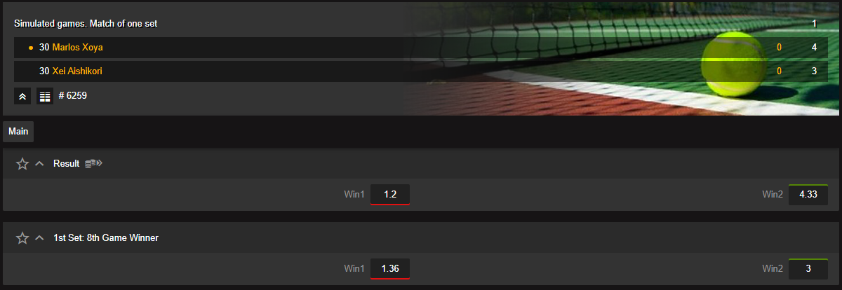 For example, the bets are offered on the simulated reality tennis match Marlos Xoya – Xei Aishikori: