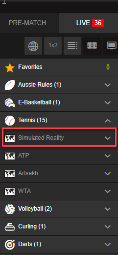 In LIVE section, simulated reality tennis is located under Tennis menu in the list of sport types: