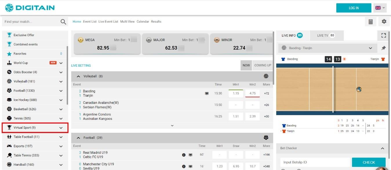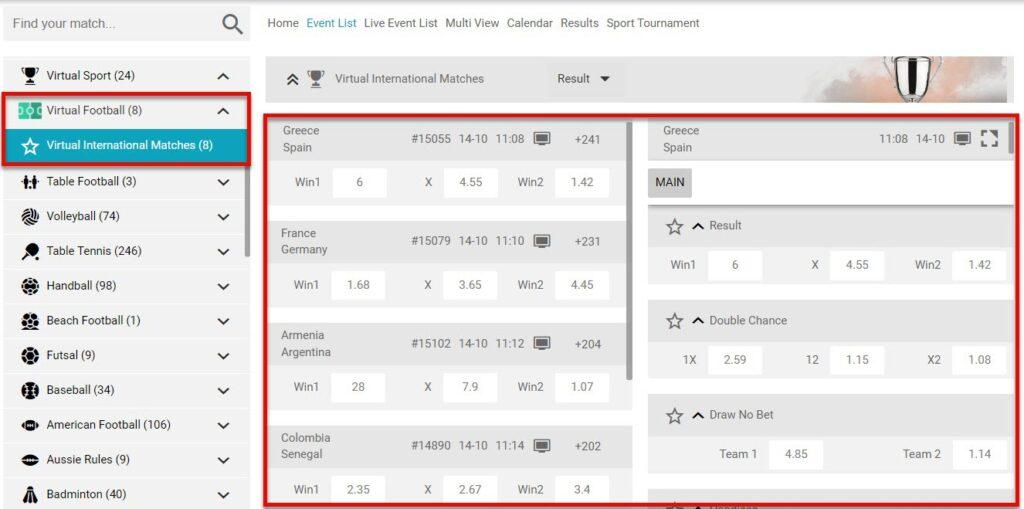 From the offered sport types click on the Virtual Sport to see all of the events: